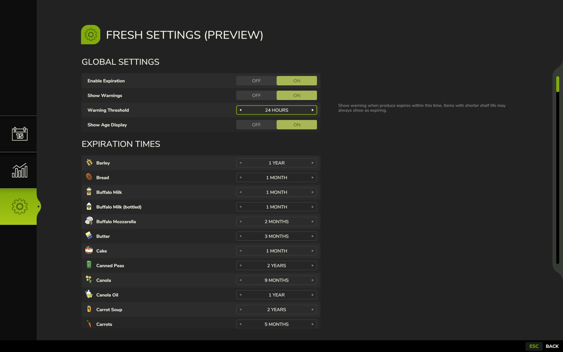Install the mod and play normally. Open Fresh Menu with Right Shift+F to view inventory, stats, and settings. Check expiry by looking at any vehicle, bale, or storage. Customize shelf lives if defaults don't suit your playstyle!